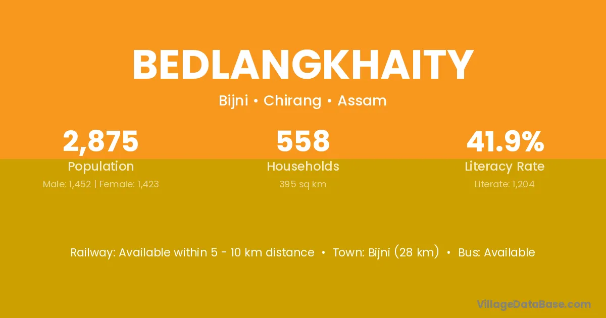 Bijni (28 km) is the nearest town to Bedlangkhaity village for major economic activities and is located approximately 28 km away.