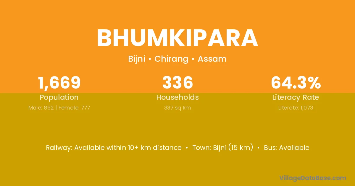 Bijni (15 km) is the nearest town to Bhumkipara village for major economic activities and is located approximately 15 km away.