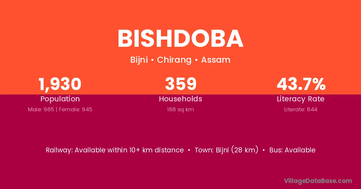 Bijni (28 km) is the nearest town to Bishdoba village for major economic activities and is located approximately 28 km away.