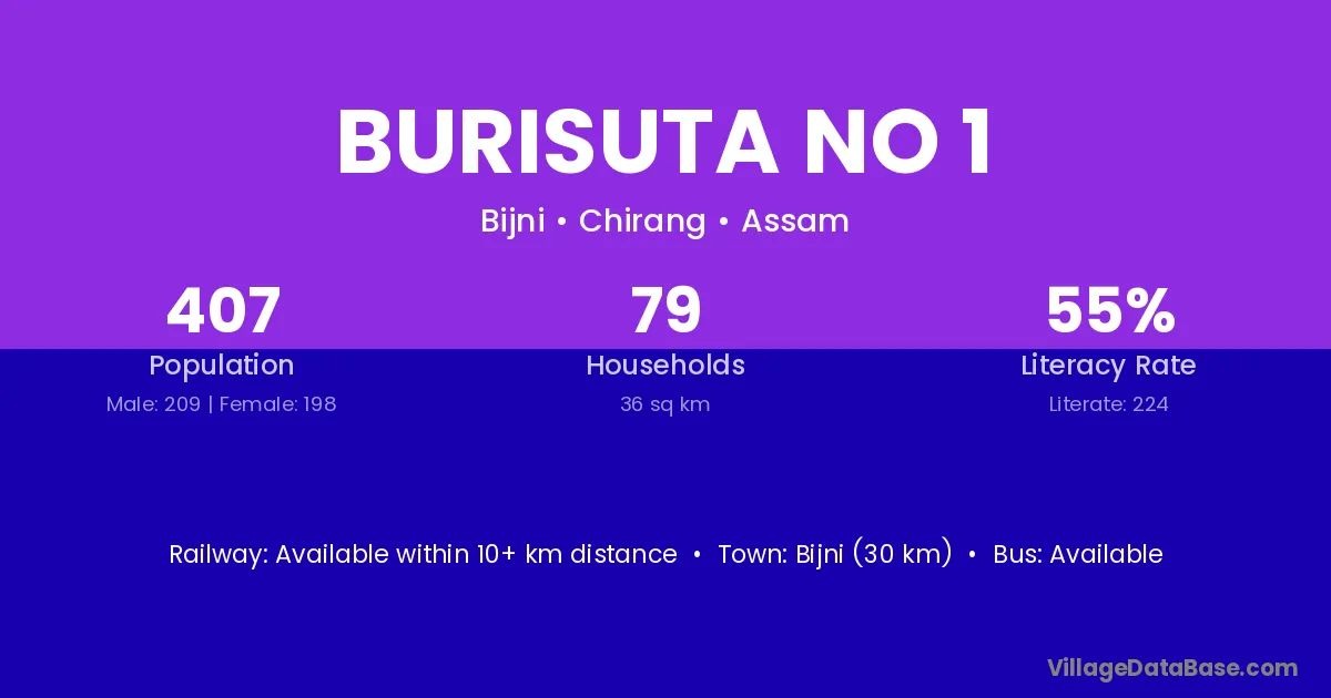 Burisuta No 1 village has a total population of 407 people, of which 209 are males and 198 are females.