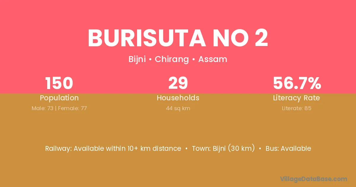 Burisuta No 2 village has a total population of 150 people, of which 73 are males and 77 are females.