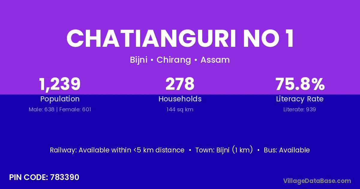 Bijni (1 km) is the nearest town to Chatianguri No 1 village for major economic activities and is located approximately 1 km away.
