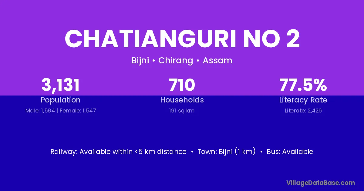 Bijni (1 km) is the nearest town to Chatianguri No 2 village for major economic activities and is located approximately 1 km away.