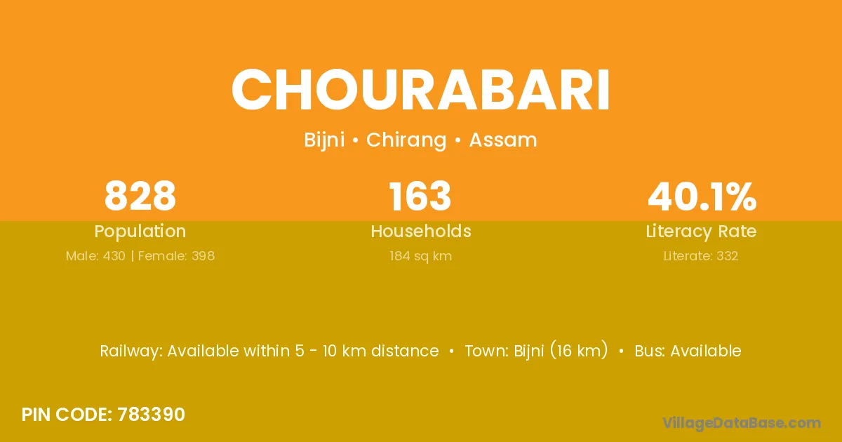 Bijni (16 km) is the nearest town to Chourabari village for major economic activities and is located approximately 16 km away.
