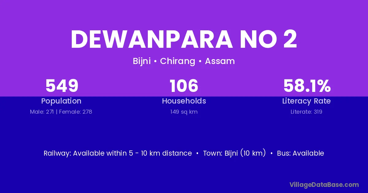 Bijni (10 km) is the nearest town to Dewanpara No 2 village for major economic activities and is located approximately 10 km away.