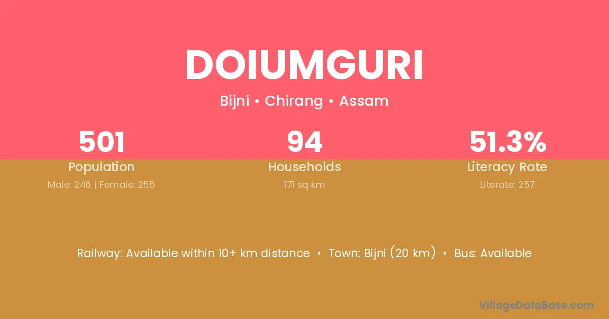 Bijni (20 km) is the nearest town to Doiumguri village for major economic activities and is located approximately 20 km away.