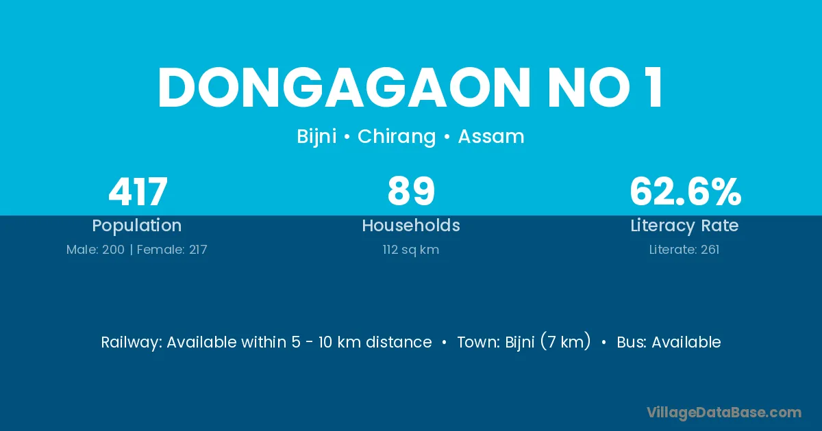 Bijni (7 km) is the nearest town to Dongagaon No 1 village for major economic activities and is located approximately 7 km away.