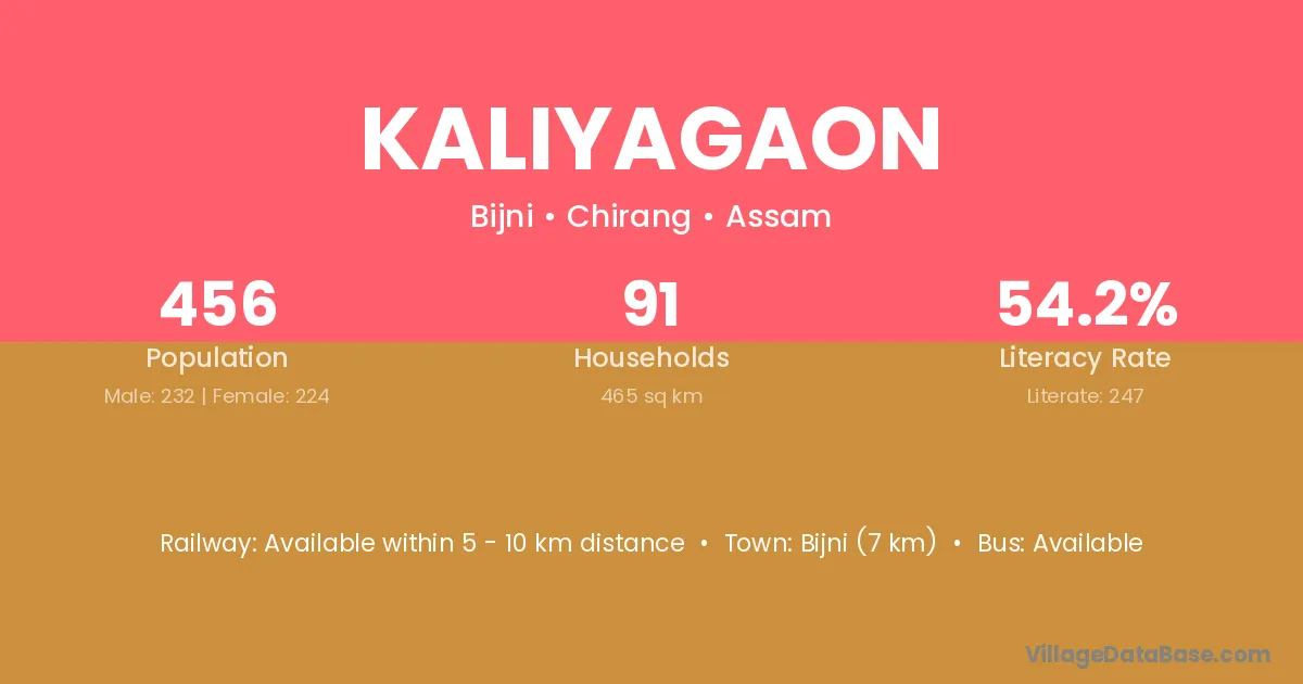 Bijni (7 km) is the nearest town to Kaliyagaon village for major economic activities and is located approximately 7 km away.