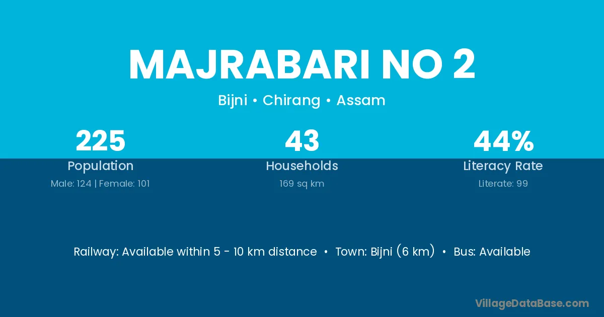 Bijni (6 km) is the nearest town to Majrabari No 2 village for major economic activities and is located approximately 6 km away.