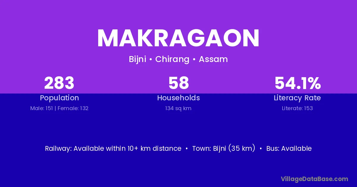 Bijni (35 km) is the nearest town to Makragaon village for major economic activities and is located approximately 35 km away.