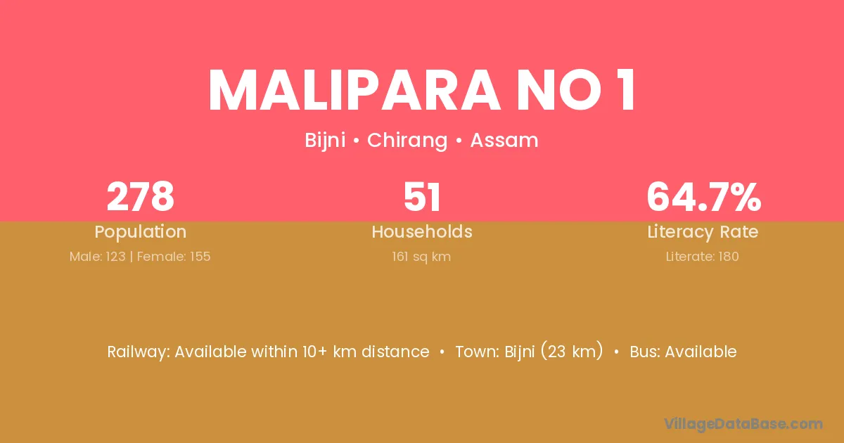 Bijni (23 km) is the nearest town to Malipara No 1 village for major economic activities and is located approximately 23 km away.
