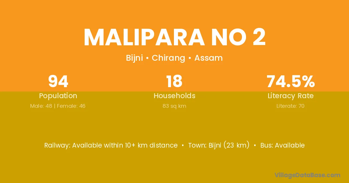 Bijni (23 km) is the nearest town to Malipara No 2 village for major economic activities and is located approximately 23 km away.