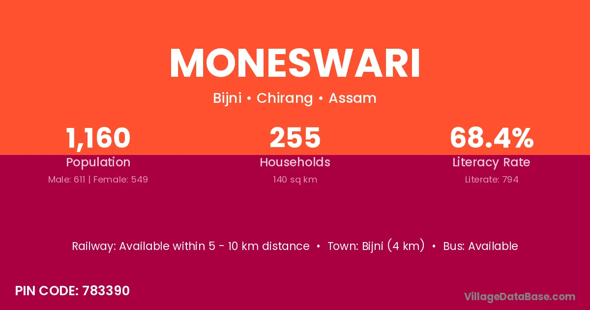 Bijni (4 km) is the nearest town to Moneswari village for major economic activities and is located approximately 4 km away.