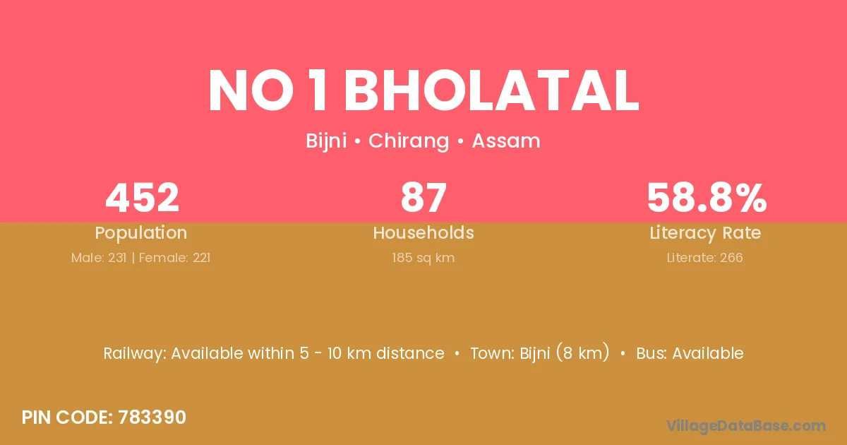 No 1 Bholatal village has a total population of 452 people, of which 231 are males and 221 are females.