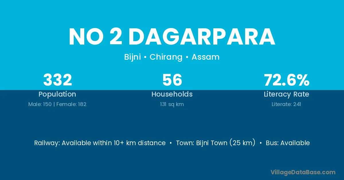 Bijni Town (25 km) is the nearest town to No 2 Dagarpara village for major economic activities and is located approximately 25 km away.