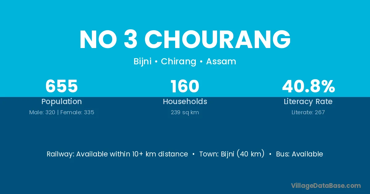 Bijni (40 km) is the nearest town to No 3 Chourang village for major economic activities and is located approximately 40 km away.