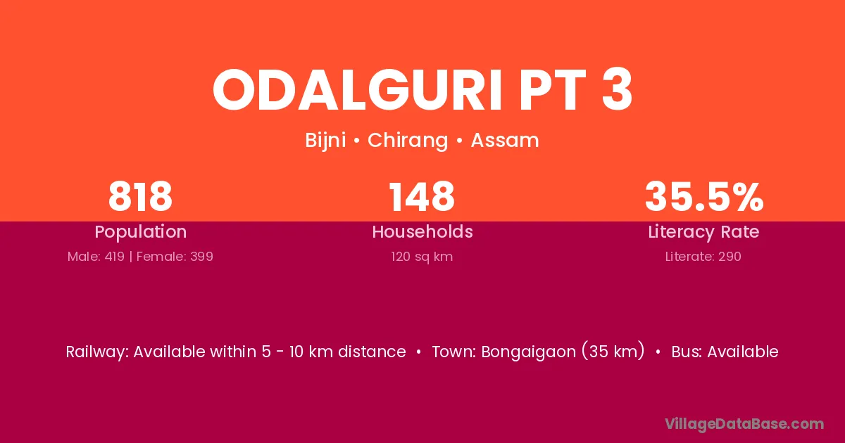 Bongaigaon (35 km) is the nearest town to Odalguri Pt 3 village for major economic activities and is located approximately 35 km away.