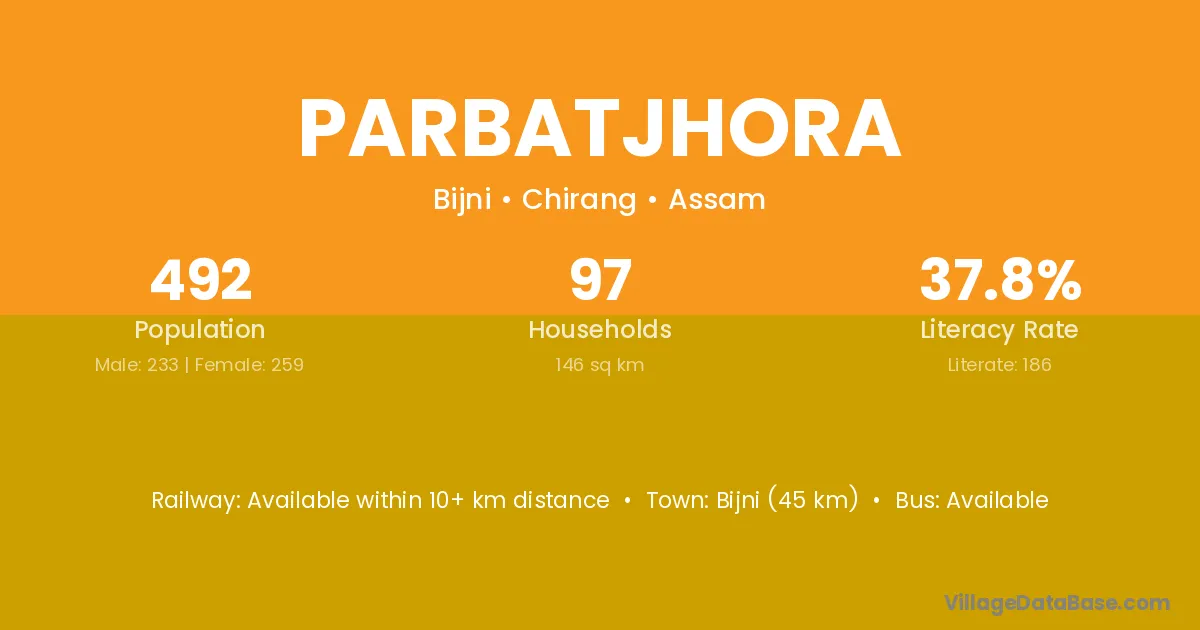 Bijni (45 km) is the nearest town to Parbatjhora village for major economic activities and is located approximately 45 km away.