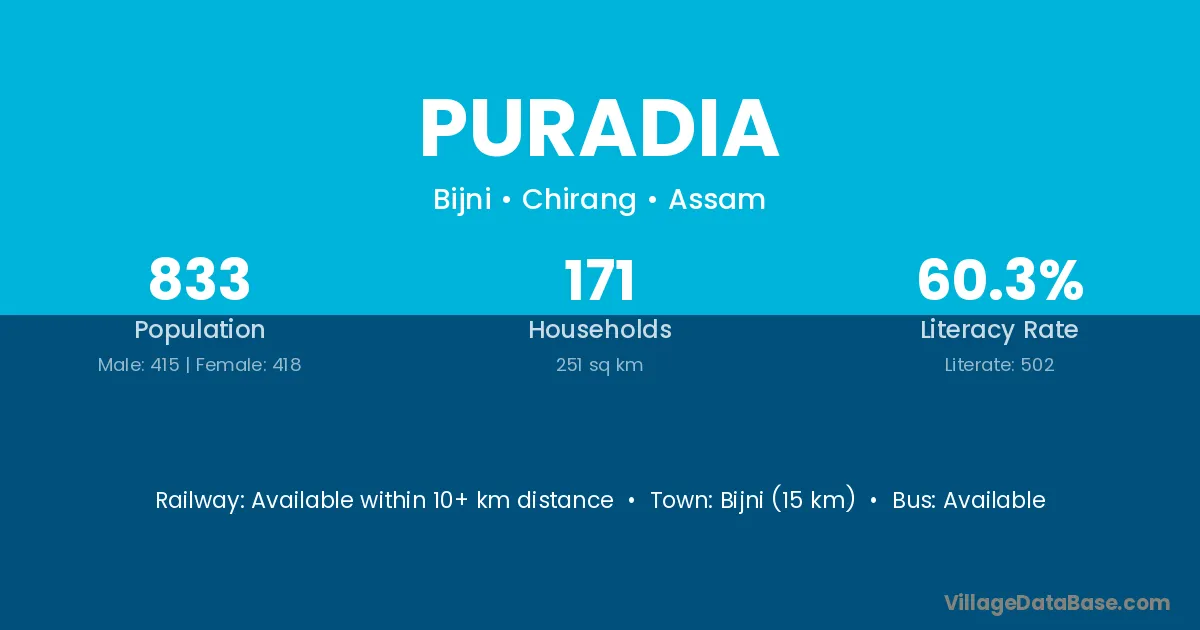 Bijni (15 km) is the nearest town to Puradia village for major economic activities and is located approximately 15 km away.