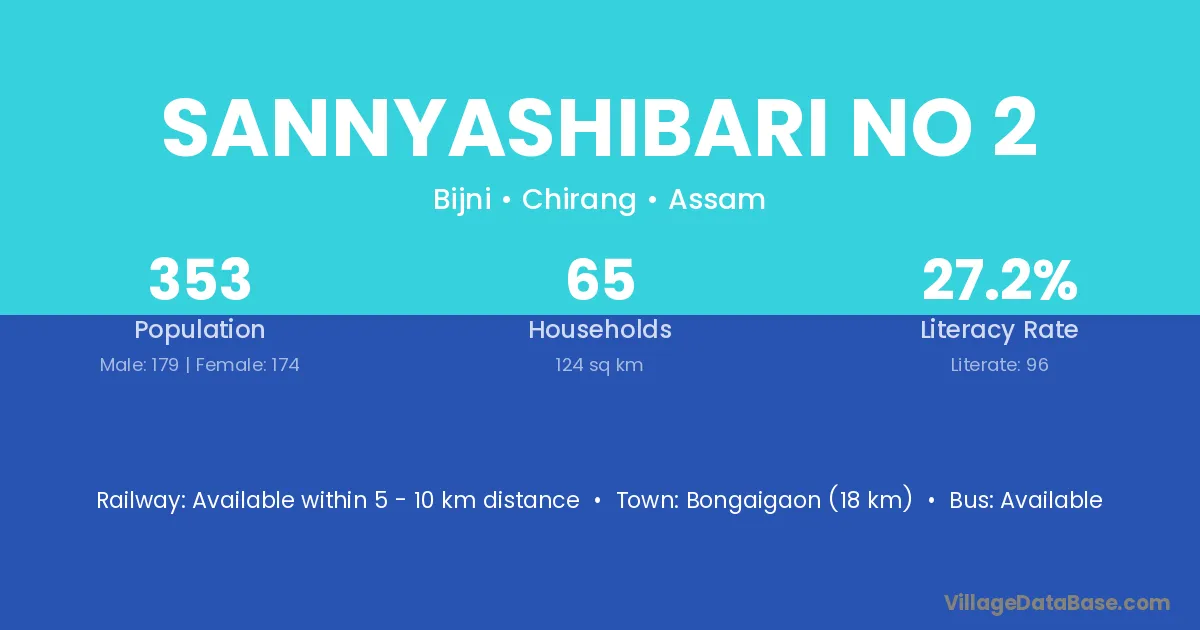 Bongaigaon (18 km) is the nearest town to Sannyashibari No 2 village for major economic activities and is located approximately 18 km away.