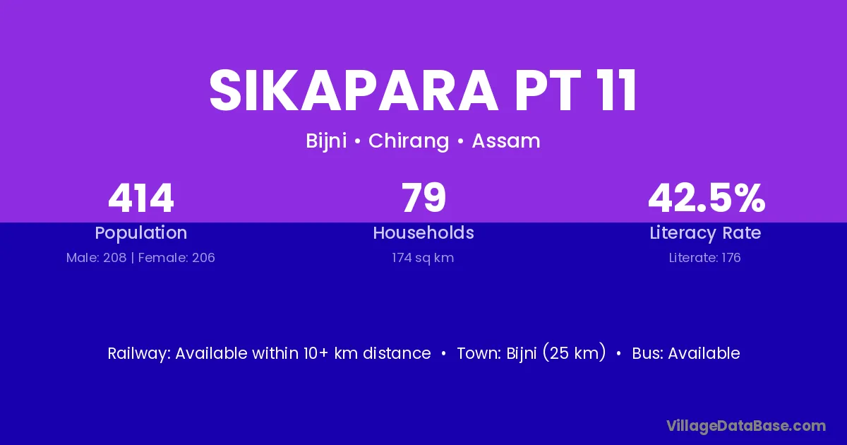Sikapara Pt 11 village has a total population of 414 people, of which 208 are males and 206 are females.