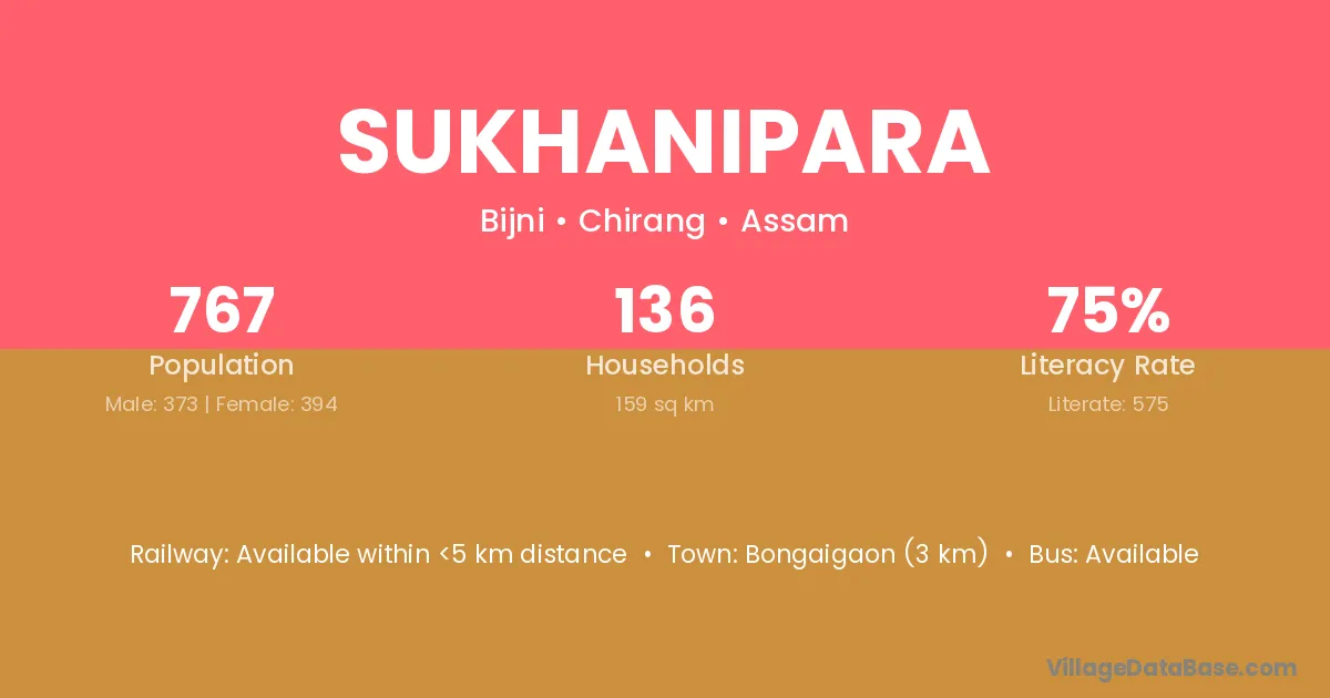 Bongaigaon (3 km) is the nearest town to Sukhanipara village for major economic activities and is located approximately 3 km away.