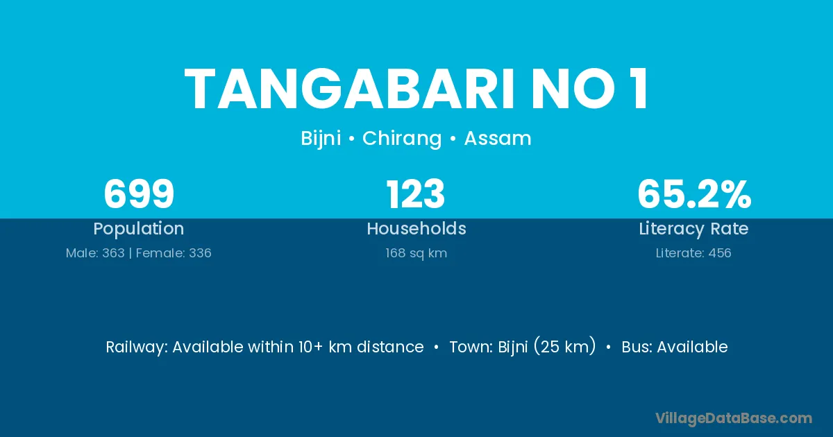 Bijni (25 km) is the nearest town to Tangabari No 1 village for major economic activities and is located approximately 25 km away.