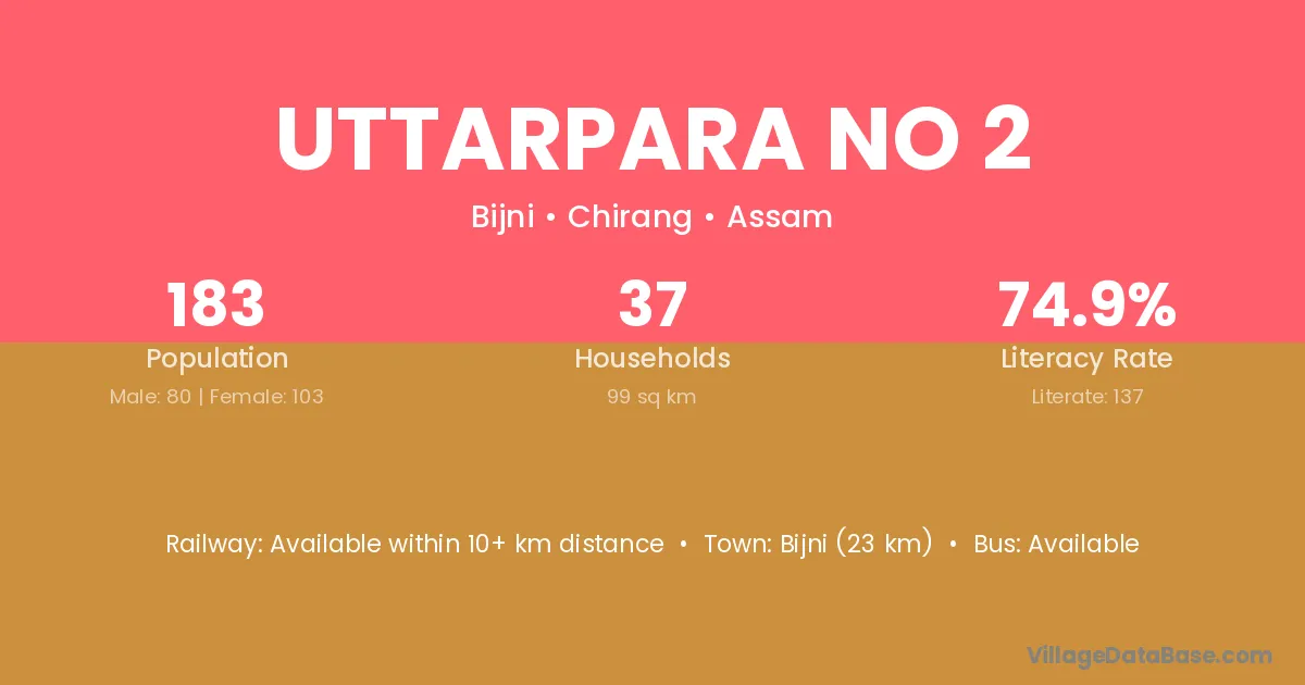 Uttarpara No 2 village has a total population of 183 people, of which 80 are males and 103 are females.