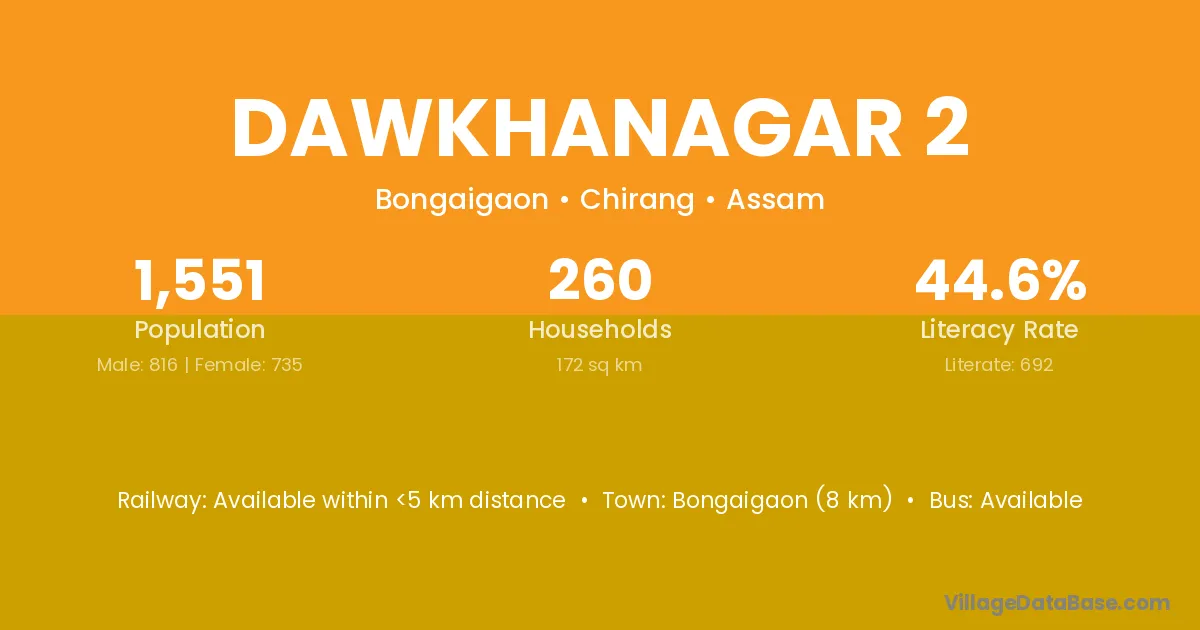 Bongaigaon (8 km) is the nearest town to Dawkhanagar 2 village for major economic activities and is located approximately 8 km away.