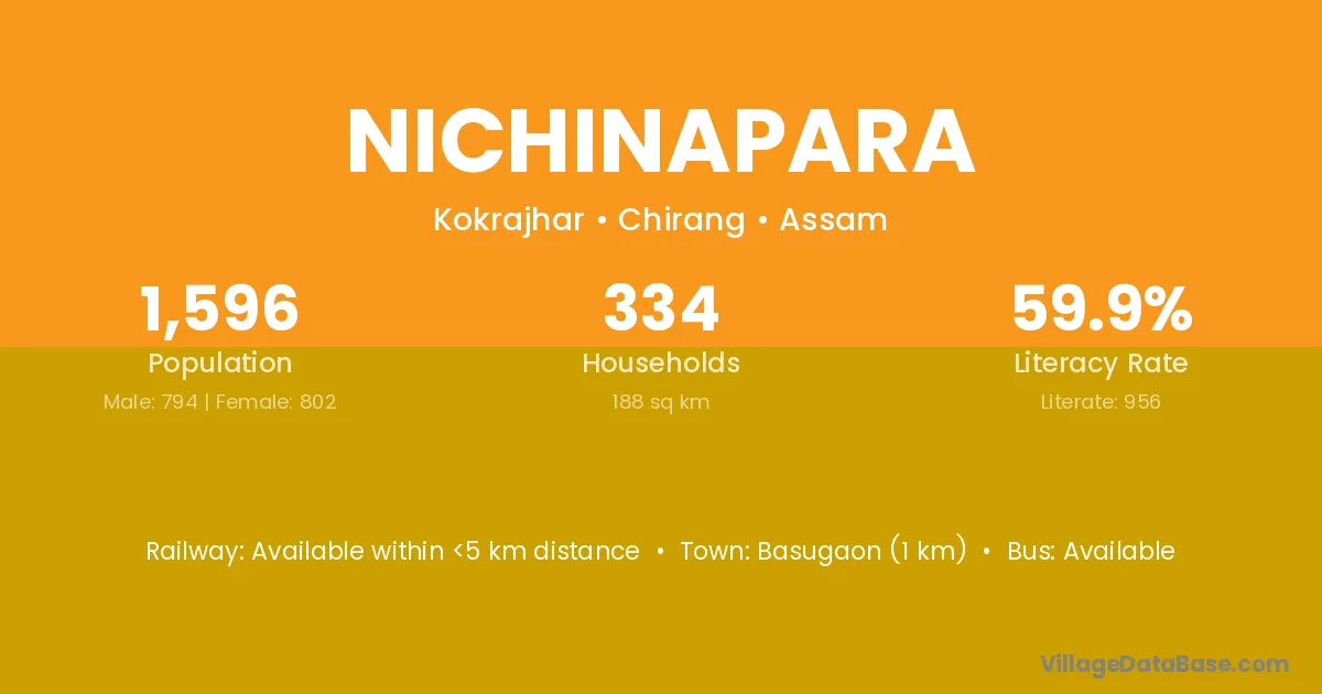 Basugaon (1 km) is the nearest town to Nichinapara village for major economic activities and is located approximately 1 km away.