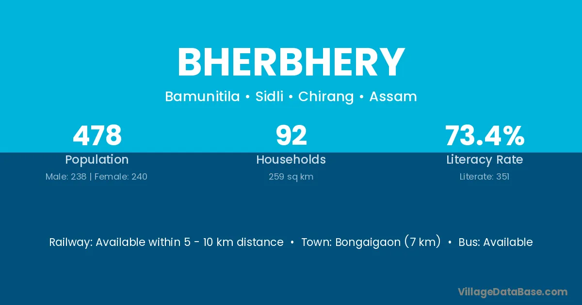 Bongaigaon (7 km) is the nearest town to Bherbhery village for major economic activities and is located approximately 7 km away.