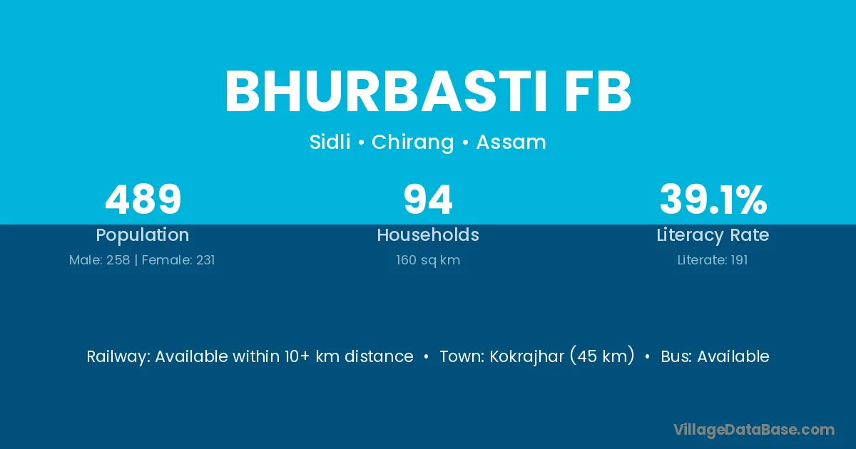 Kokrajhar (45 km) is the nearest town to Bhurbasti Fb village for major economic activities and is located approximately 45 km away.