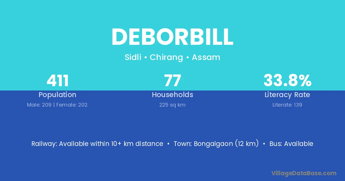 Bongaigaon (12 km) is the nearest town to Deborbill village for major economic activities and is located approximately 12 km away.