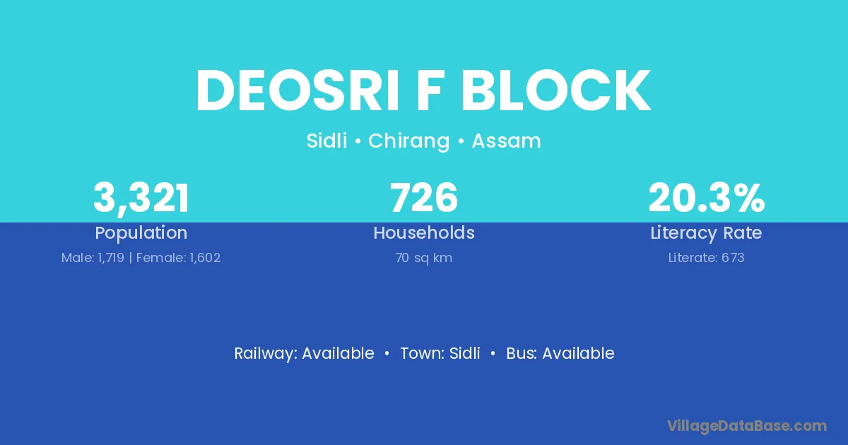 Deosri F Block village has a total population of 3,321 people, of which 1,719 are males and 1,602 are females.