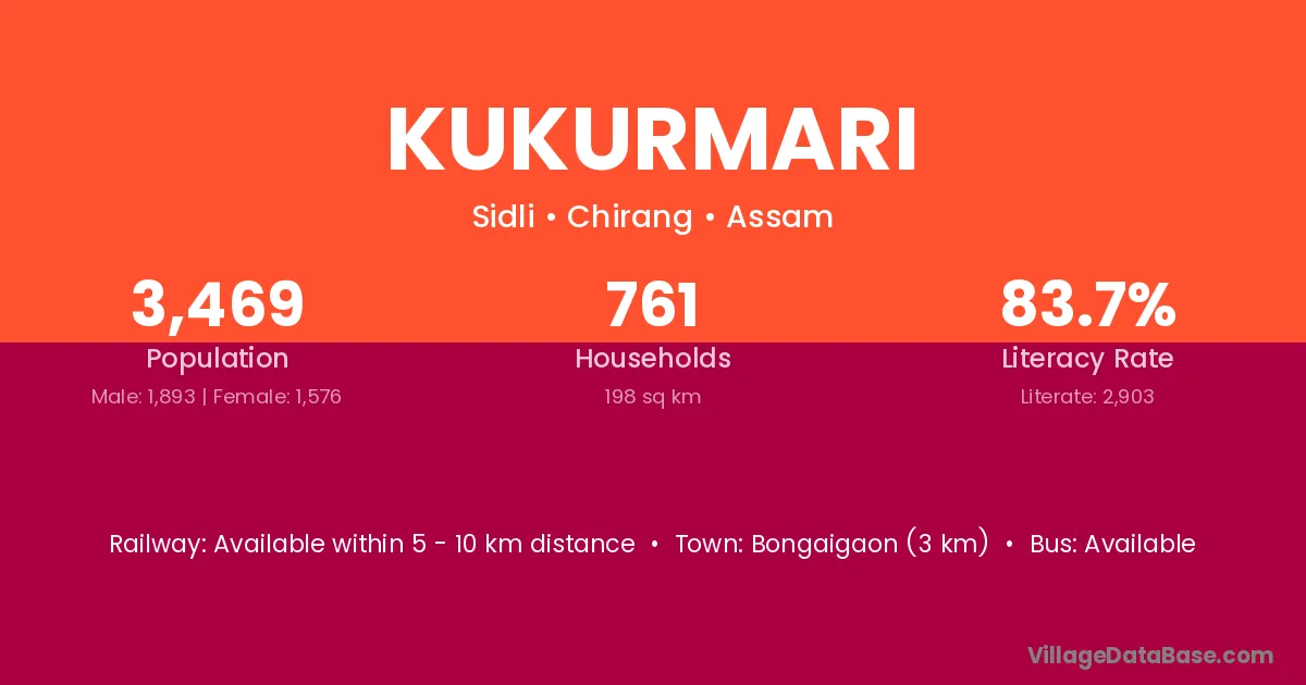 Bongaigaon (3 km) is the nearest town to Kukurmari village for major economic activities and is located approximately 3 km away.