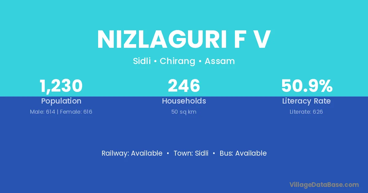 Nizlaguri F V village has a total population of 1,230 people, of which 614 are males and 616 are females.