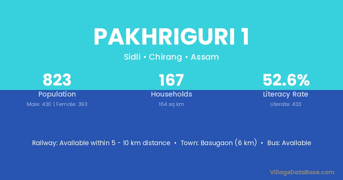 Pakhriguri 1 village has a total population of 823 people, of which 430 are males and 393 are females.