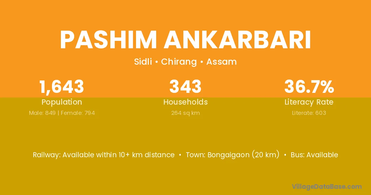 Pashim Ankarbari village has a total population of 1,643 people, of which 849 are males and 794 are females.