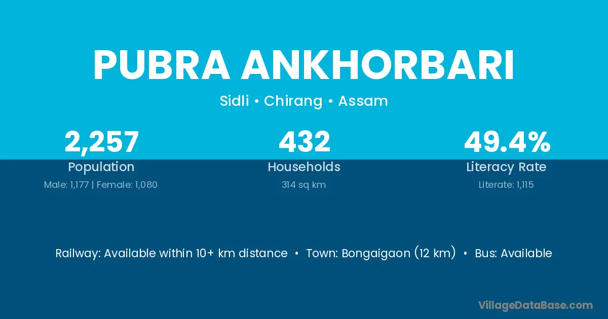 Bongaigaon (12 km) is the nearest town to Pubra Ankhorbari village for major economic activities and is located approximately 12 km away.
