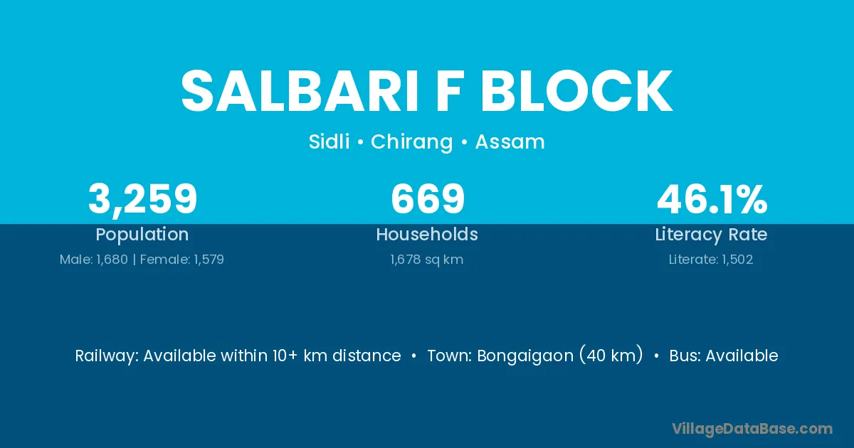 Bongaigaon (40 km) is the nearest town to Salbari F Block village for major economic activities and is located approximately 40 km away.