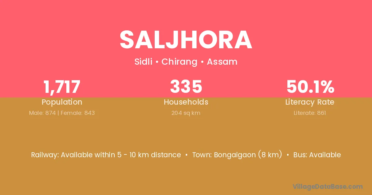 Bongaigaon (8 km) is the nearest town to Saljhora village for major economic activities and is located approximately 8 km away.