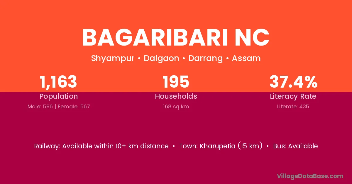 Bagaribari Nc village has a total population of 1,163 people, of which 596 are males and 567 are females.
