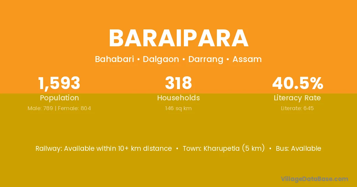 Kharupetia (5 km) is the nearest town to Baraipara village for major economic activities and is located approximately 5 km away.
