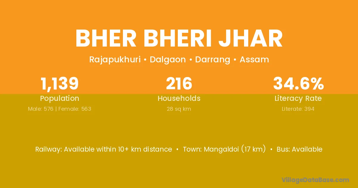 Mangaldoi (17 km) is the nearest town to Bher Bheri Jhar village for major economic activities and is located approximately 17 km away.