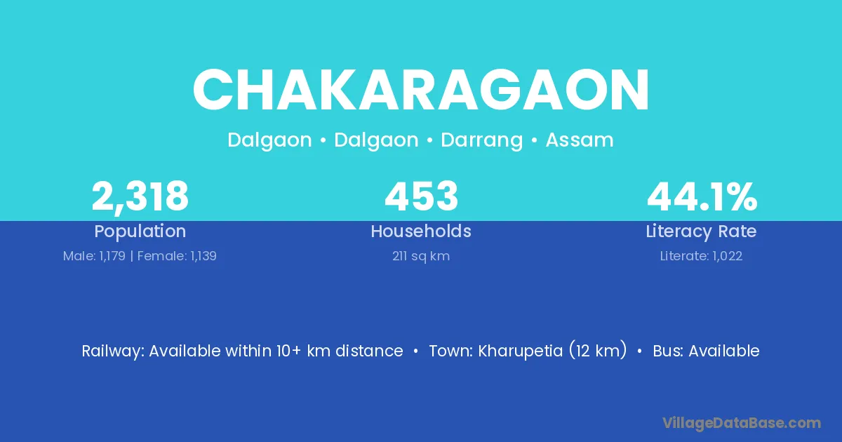 Kharupetia (12 km) is the nearest town to Chakaragaon village for major economic activities and is located approximately 12 km away.