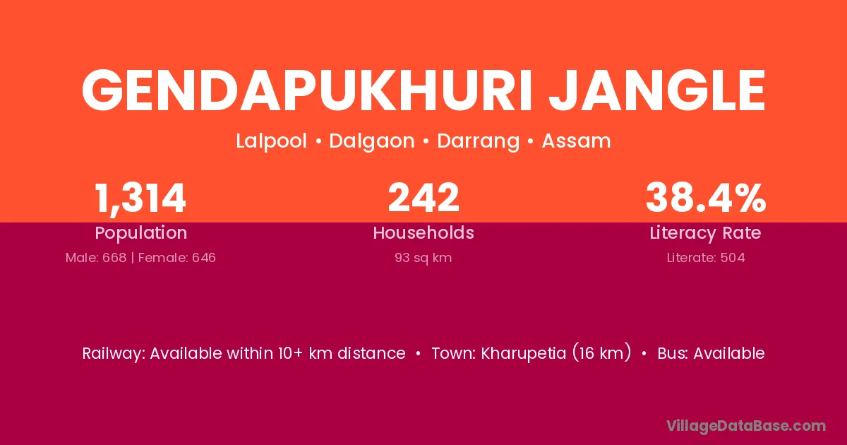 Kharupetia (16 km) is the nearest town to Gendapukhuri Jangle village for major economic activities and is located approximately 16 km away.