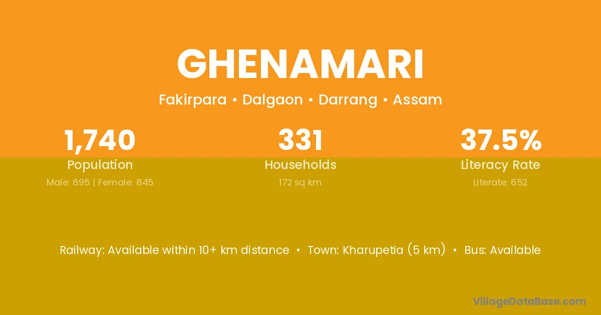Kharupetia (5 km) is the nearest town to Ghenamari village for major economic activities and is located approximately 5 km away.