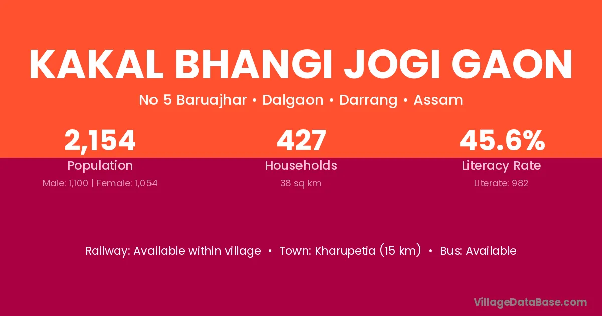 Kakal Bhangi Jogi Gaon village has a total population of 2,154 people, of which 1,100 are males and 1,054 are females.