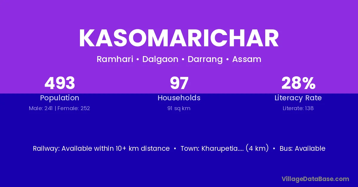 Kharupetia.... (4 km) is the nearest town to Kasomarichar village for major economic activities and is located approximately 4 km away.