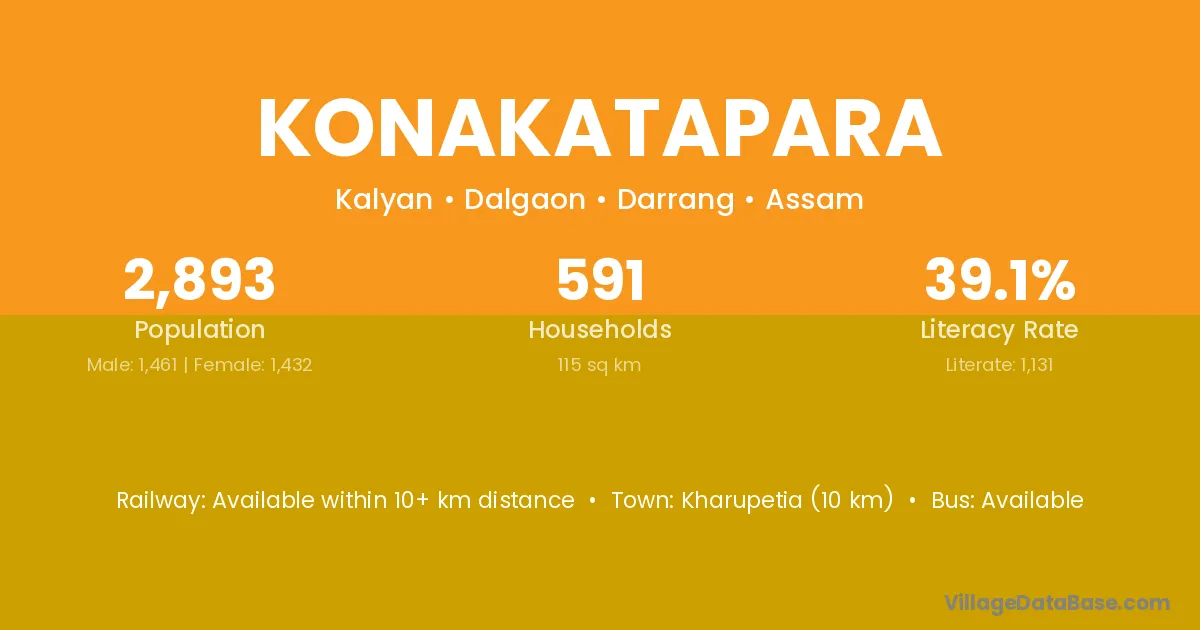Kharupetia (10 km) is the nearest town to Konakatapara village for major economic activities and is located approximately 10 km away.